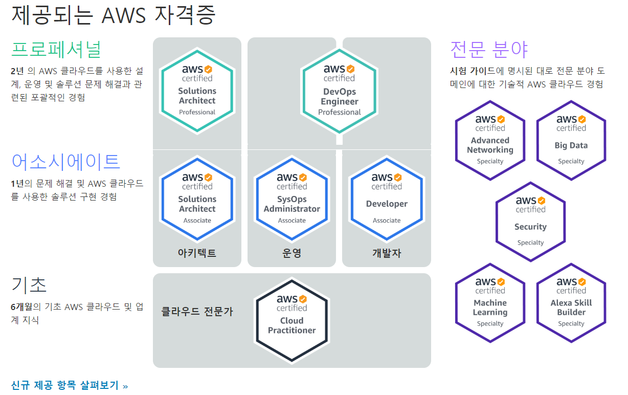 | Professional | AWS Solution Architect | - 2년 이상의 AWS 운영/관리 경험 - 스크립트 언어, OS 및 AWS API, CLI, 관리 콘솔 등에 대한 지식 보유 - 핵심 AWS 기술을 이용한 하이브리드 아키텍쳐 설계 |