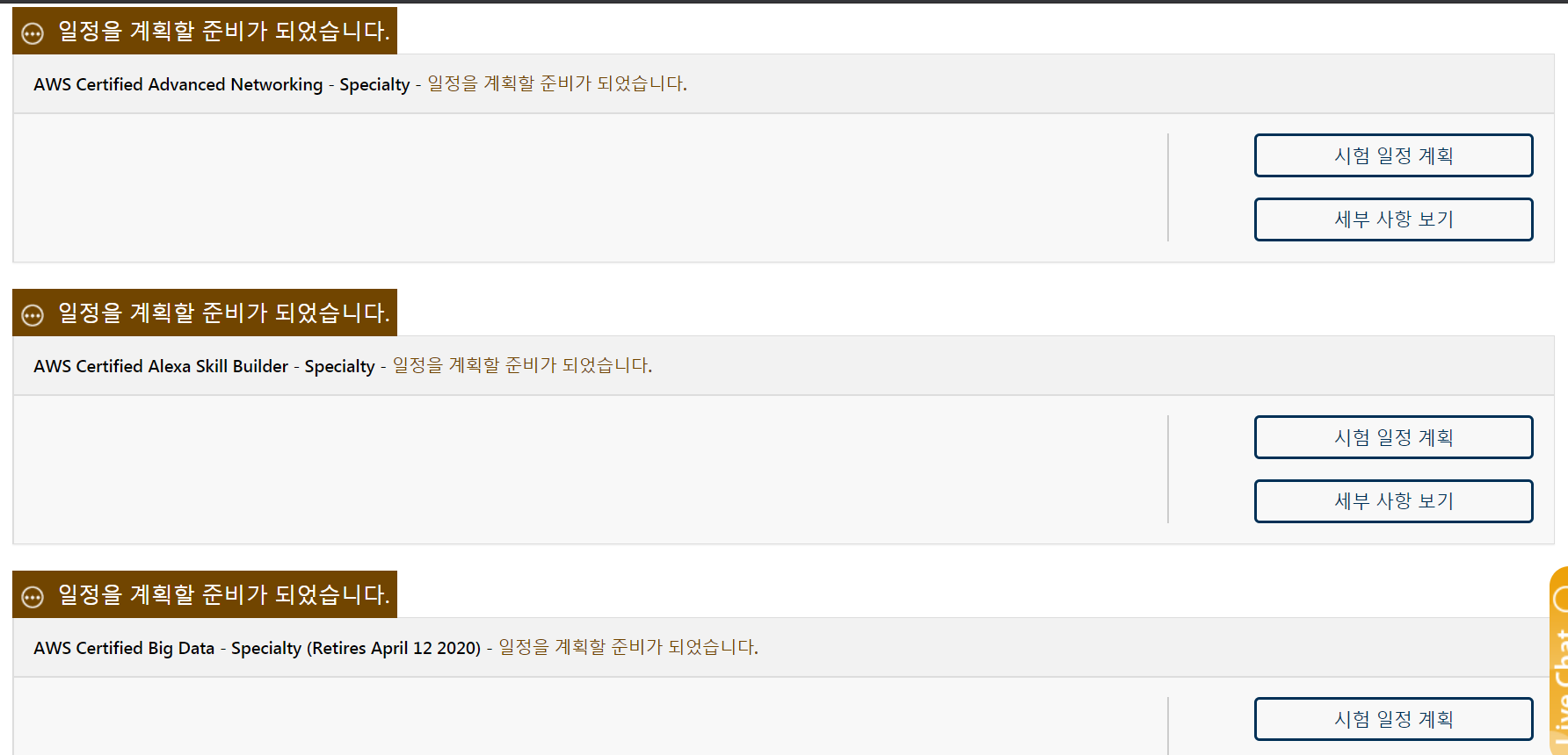| AWS Big Data | - AWS 기술 경력 2년 이상의 빅데이터 분석을 수행하는 전문가 - AWS 빅 데이터 서비스를 정의하고 설계할 수 있는 배경 지식 보유 - 2020년 4월 부터는 AWS Big Data Analytics 이름으로 제공됨 |